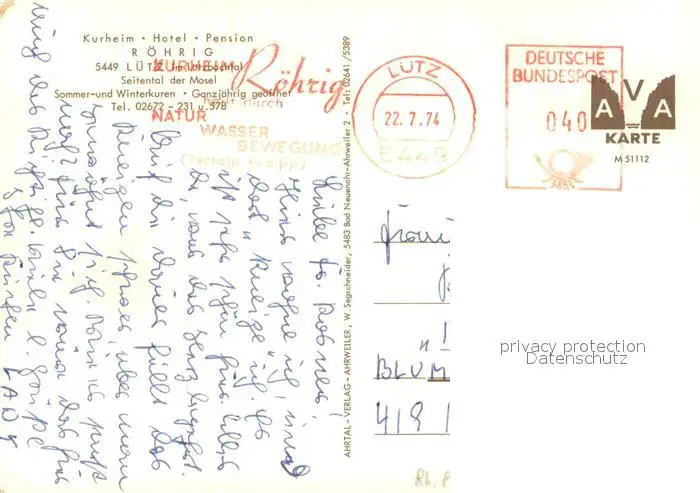Luetz Kurheim Hotel Pension Roehrig Liegewiese Kegelbahn hallenbad Park Kaminzimmer Garten Aufenthaltsraum Luetz postalisch gelaufen 1974 Erhaltung siehe scans [WerneD78] WernPID7