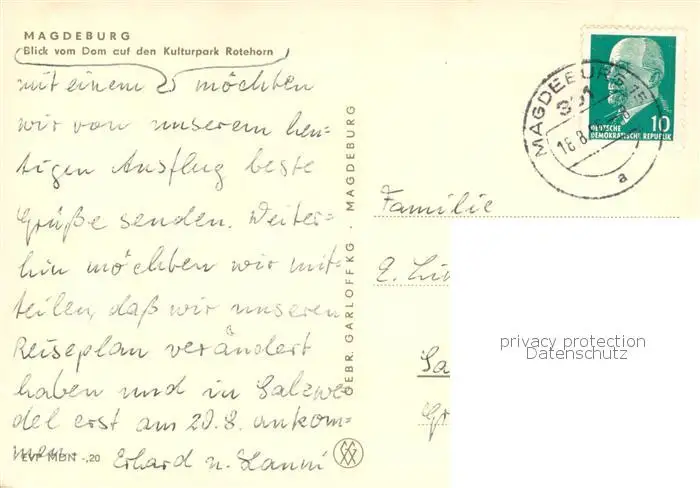 Magdeburg_Elbe Blick vom Dom auf den Kulturpark Rotehorn postalisch gelaufen 1956 Erhaltung siehe scans [FriedD77] Frierer