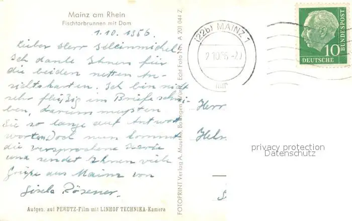 Mainz_Rhein Fischtorbrunnen mit Dom Mainz Rhein postalisch gelaufen 1956 Erhaltung siehe scans [WerneD78] WernPID7