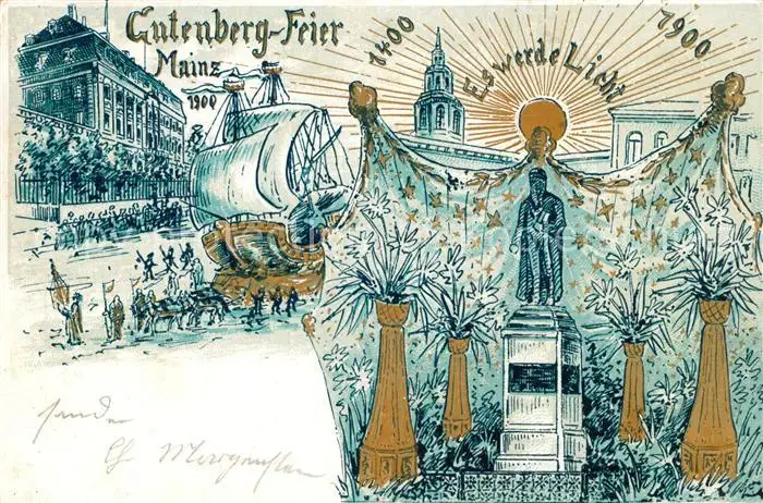 Mainz Rhein Kategorie Alte Ansichtskarten Postkarten bx80857 Mainz_Rhein Gutenberg Feier Es werde Licht Mainz Rhein postalisch gelaufen 1900 Erhaltung siehe scans [KathaD81]