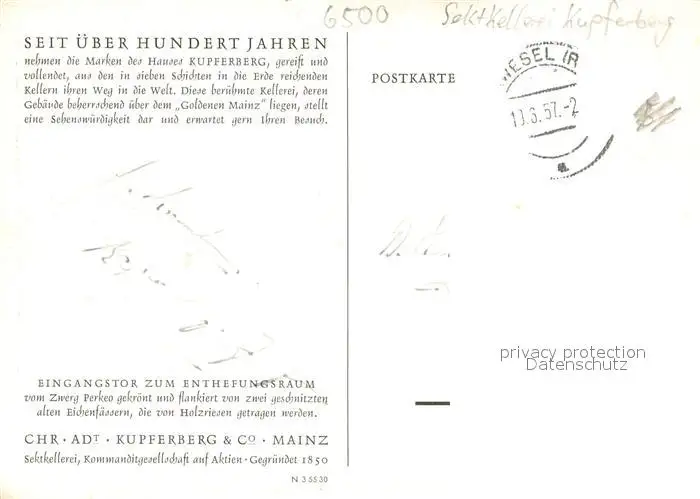 Mainz_Rhein Kupferberg Sektkellerei Mainz Rhein postalisch nicht gelaufen 1957 Erhaltung siehe scans [WerneD78] WernPID7