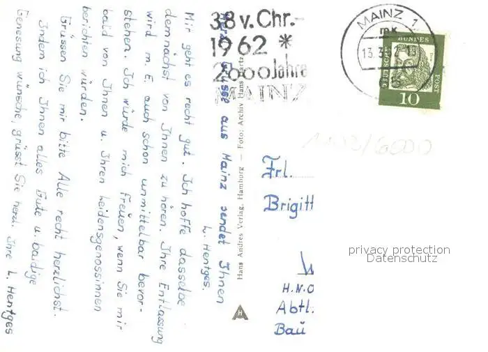 Mainz_Rhein Leichhof Thetater Dom Schloss Mainz Rhein postalisch gelaufen 1962 Erhaltung siehe scans [NatalD47] NataID47