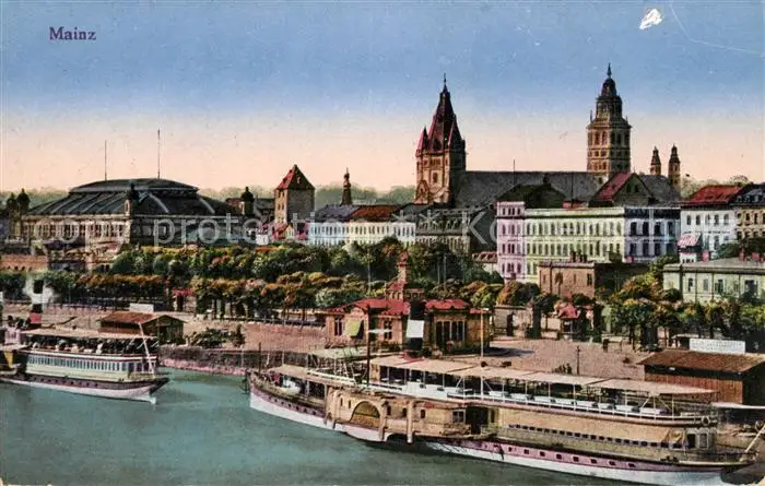 Mainz_Rhein Panorama Blick ueber den Rhein zum Dom Rheindampfer Mainz Rhein postalisch nicht gelaufen bis 1920 Erhaltung siehe scans [FriedD77] Frierer
