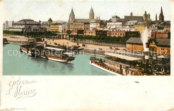 Mainz_Rhein Panorama Blick ueber den Rhein zum Dom Rheindampfer Mainz Rhein postalisch nicht gelaufen bis 1920 Erhaltung siehe scans [FriedD77] Frierer