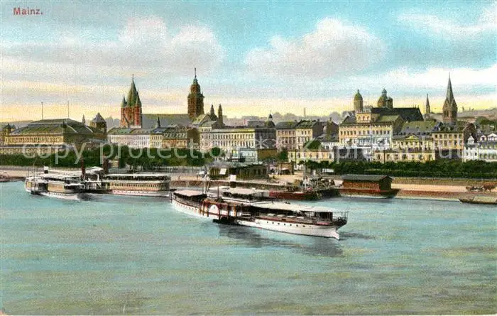 Mainz_Rhein Panorama Blick ueber den Rhein zum Dom Rheindampfer Mainz Rhein postalisch nicht gelaufen bis 1920 Erhaltung siehe scans [FriedD77] Frierer