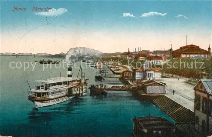 Mainz_Rhein Partie am Rheinufer Dampfschiff Mainz Rhein postalisch gelaufen 1915 Bahnpost Erhaltung siehe scans [WerneD78] Bahnpost WernPID7