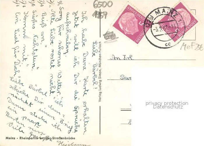 Mainz_Rhein Rheinpartie an der Strassenbruecke Mainz Rhein postalisch gelaufen 1957 Erhaltung siehe scans [WerneD78] WernPID7