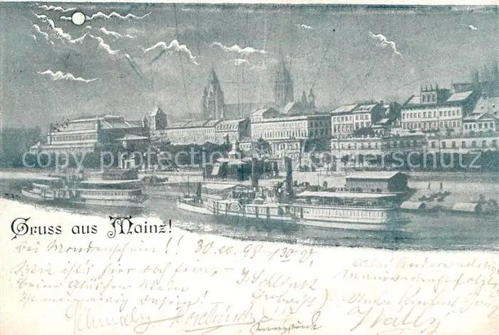 Mainz_Rhein Rheinufer Dampfer Stadtbild mit Festhalle und Dom im Mondschein Deutsche Reichspost Mainz Rhein postalisch gelaufen 1898 Erhaltung siehe scans [FriedD77] Frierer