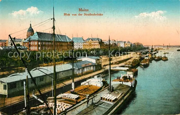 AK / Ansichtskarte Mainz_Rhein Rheinufer Frachtkaehne Dampfer Blick von der Strassenbruecke Mainz Rhein