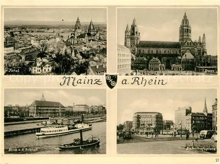 Mainz_Rhein Stadtpanorama Dom Rheindampfer Schloss Bahnhofsplatz Mainz Rhein postalisch nicht gelaufen 1921-1965 Erhaltung siehe scans [FriedD77] Frierer