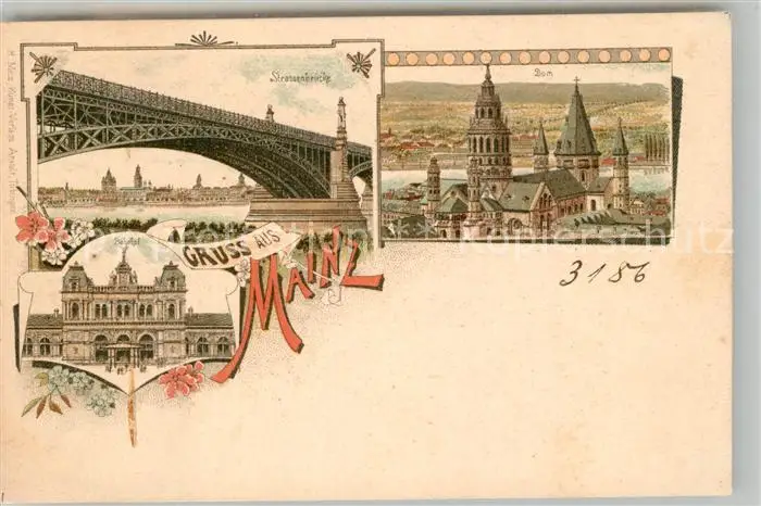 Mainz_Rhein Strassenbruecke Dom Bahnhof Litho Deutsche Reichspost Mainz Rhein postalisch nicht gelaufen bis 1920 Erhaltung siehe scans [FriedD77] Frierer