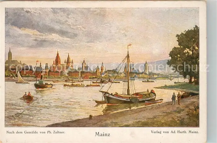 Mainz_Rhein Uferpartie am Rhein mit Blick zur Stadt Gemaelde von Ph. Zeltner Kuenstlerkarte Mainz Rhein postalisch nicht gelaufen 1921-1965 Erhaltung siehe scans [FriedD77] Frierer