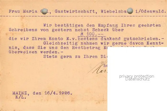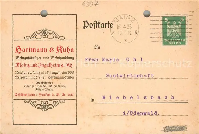 Mainz_Rhein Weingut Hartmann und Kuhn Korrespondenz Mainz Rhein postalisch gelaufen 1926 Erhaltung siehe scans [FriedD77] Frierer