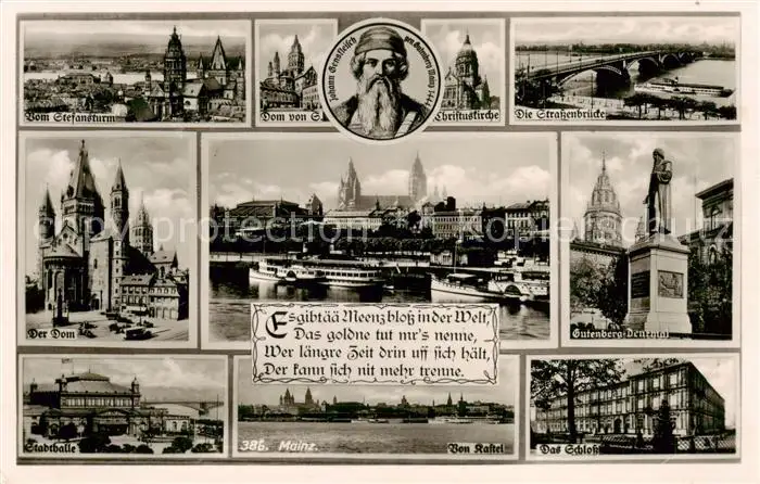 Mainz__Rhein Stefansturm Dom Johann Gensfleisch Portrait Christuskirche Strassenbruecke Der Dom Panorama Gutenbergdenkmal Mainz Schloss postalisch gelaufen 1939 Erhaltung siehe scans [FriedD77] Frierer
