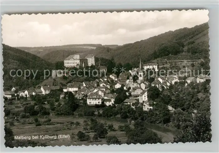 Malberg_Eifel Stadtpanorama mit Schloss und Kirche Malberg Eifel postalisch nicht gelaufen 1967 Erhaltung siehe scans [FriedD77] Frierer