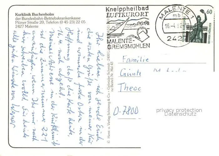 Malente-Gremsmuehlen Kurklinik Buchenholm Spielwiese Kegelbahn Hallenbad Speisesaal Malente-Gremsmuehlen postalisch gelaufen 1992 Erhaltung siehe scans [WerneD78] WernPID7