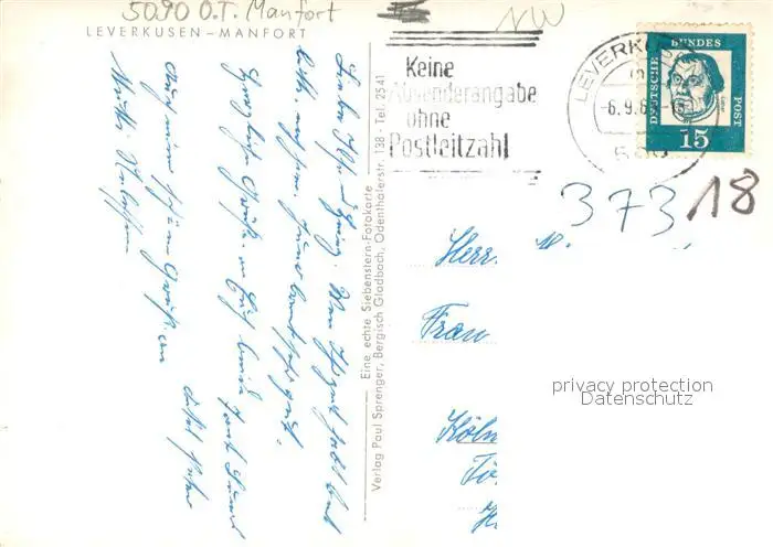 Manfort Siedlung Bahnstrasse Wohnhochhaus Ev Johanniskirche Kath Kirche Manfort postalisch gelaufen 1965 Erhaltung siehe scans [WerneD78] WernPID7