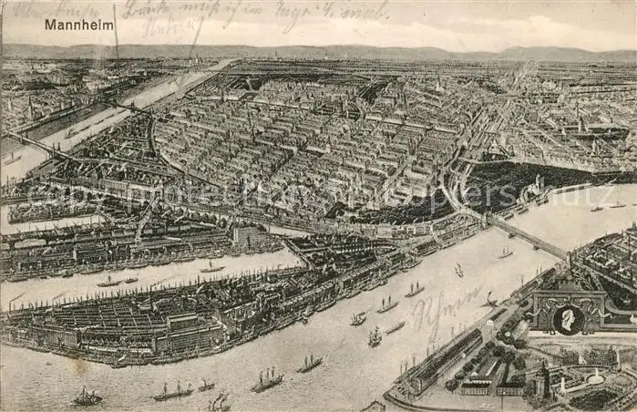 Mannheim Rheinpartie Vogelschau Mannheim postalisch gelaufen 1913 Erhaltung siehe scans [LiesaD40] LiesID40
