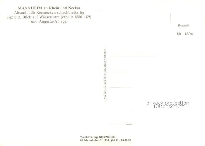 Mannheim_Rhein Altstadt mit Wasserturm und Augusta Anlage Fliegeraufnahme postalisch nicht gelaufen nach 1965 Erhaltung siehe scans [WerneD78] WernPID7