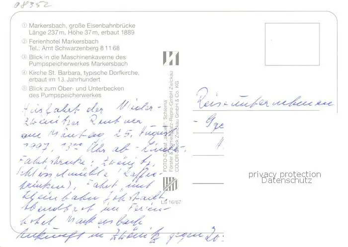 Markersbach_Bad_Gottleuba Eisenbahnbruecke Ferienhotel Markersbach Maschinenkaverne des Pumpspeicherwerkes Kirche St Barbara Pumpspeicherwerk Fliegeraufnahme postalisch nicht gelaufen nach 1965 Erhaltung siehe scans [FriedD77] Frierer