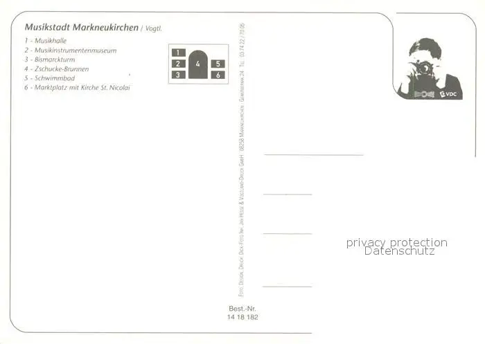 Markneukirchen Musikhalle Musikinstrumentenmuseum Bismarckturm Zschucke-Brunnen Schwimmbad Marktplatz Markneukirchen postalisch nicht gelaufen nach 1965 Erhaltung siehe scans [LiesaD40] LiesID40