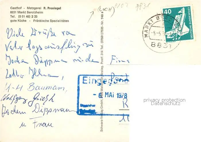 Markt_Berolzheim Panorama Gasthof Metzgerei Prosiegel Gaststube Markt Berolzheim postalisch nicht gelaufen nach 1965 Erhaltung siehe scans [WerneD78] WernPID7