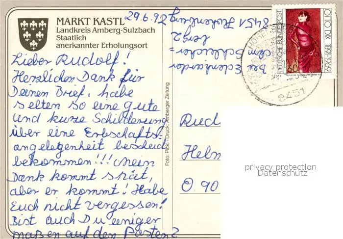 Markt_Kastl Kategorie Alte Ansichtskarten Postkarten bx52840 Markt_Kastl Blumenwiese Blick zum Schloss Ortskern Freibad Markt_Kastl postalisch gelaufen 1992 Erhaltung siehe scans [FriedD77]