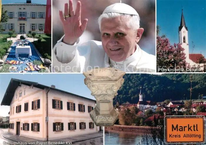AK / Ansichtskarte Marktl_Inn Geburtshaus von Pabst Benedikt Pfarrhof Taufstein Pfarrkirche Marktl_Inn