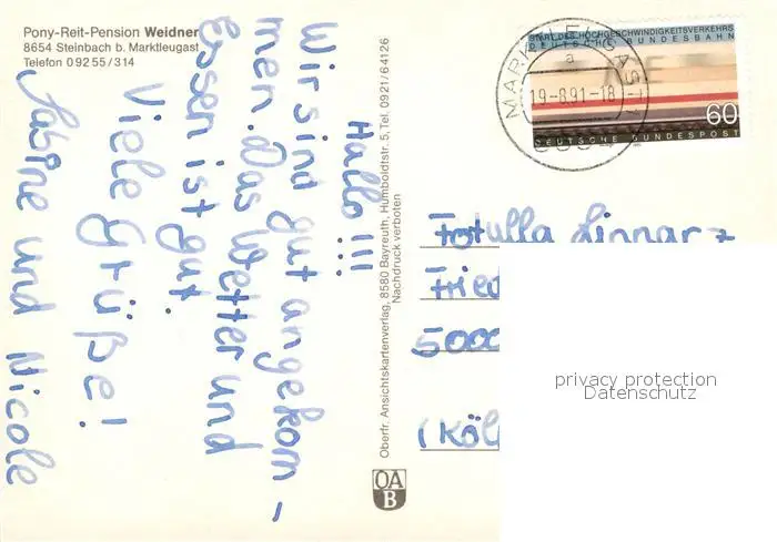 Marktleugast Kategorie Alte Ansichtskarten Postkarten bx48651 Marktleugast Steinbach Pony Reif Pension Weider Pferdeschlitten Marktleugast postalisch gelaufen 1991 Erhaltung siehe scans [LiesaD40]