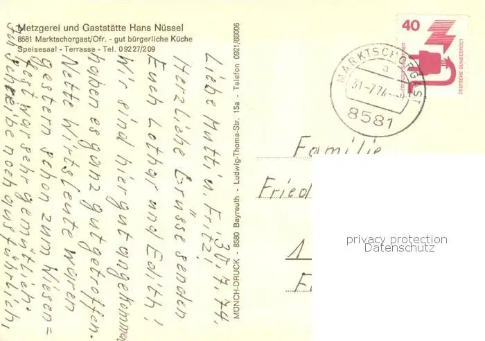 Marktschorgast Metzgerei und Gaststaette Hans Nuessel Gastraeume Marktschorgast postalisch gelaufen 1974 Erhaltung siehe scans [WerneD78] WernPID7