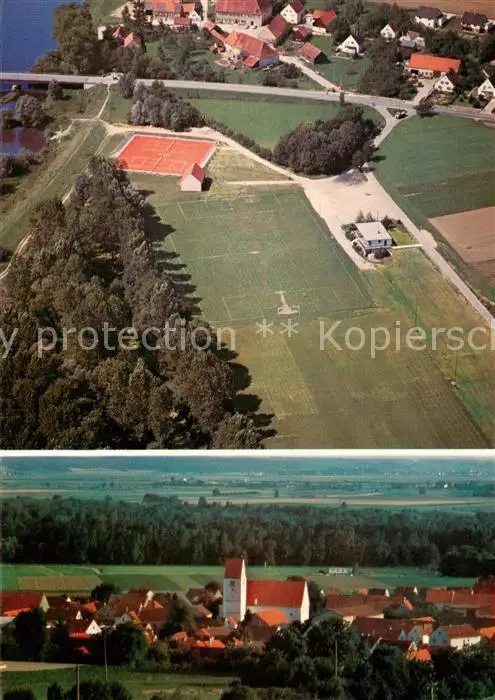 AK / Ansichtskarte Marxheim_Bayern Fliegeraufnahme Sport und Freizeitgelaende mit OT Bruck Blick von Norden mit Pfarrkirche St Peter und Paul Marxheim Bayern