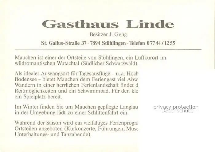 Mauchen_Stuehlingen Gasthaus Linde Mauchen_Stuehlingen postalisch nicht gelaufen nach 1965 Werbekarte (keine Postkarte) Erhaltung siehe scans [FriedD77] Werbekarte (keine Postkarte) Frierer