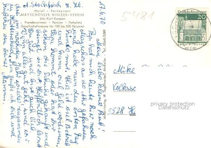 Mayschoss Hotel Restaurant Mayschosser Winzerverein Mayschoss postalisch gelaufen 1970 Erhaltung siehe scans [FriedD77] Frierer