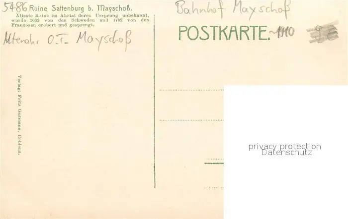 Mayschoss Ruine Sattenburg Ahrtal und Bahnhof Mayschoss postalisch nicht gelaufen 1910 Erhaltung siehe scans [WerneD78] WernPID7