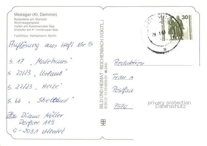 Meesiger Campingplatz C/2 Gravelotte am Kummerower See Mecklenburgische Seenplatte Meesiger postalisch gelaufen 1991 Erhaltung siehe scans [FriedD77] Frierer
