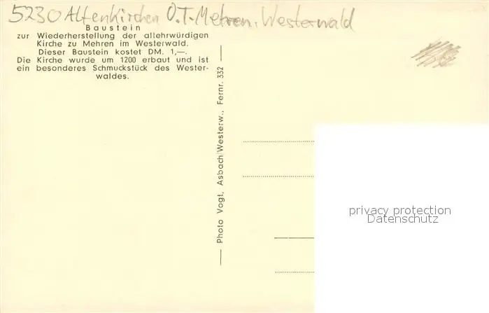 Mehren_Westerwald Baustein zur Wiederherstellung der Kirche Mehren_Westerwald postalisch nicht gelaufen 1921-1965 Erhaltung siehe scans [FriedD77] Frierer