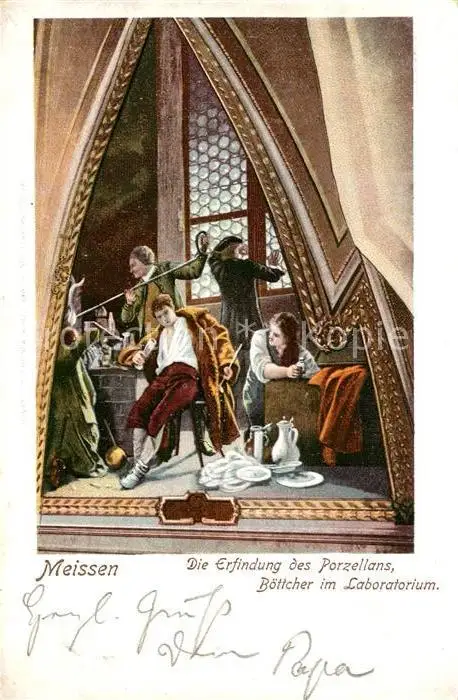 Meissen_Elbe_Sachsen Die Erfindung des Porzellans Boettcher im Laboratorium Kuenstlerkarte Meissen_Elbe_Sachsen postalisch gelaufen 1902 Erhaltung siehe scans [FriedD77] Frierer