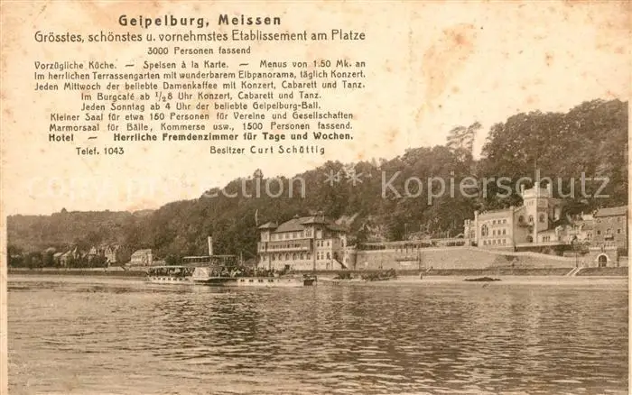Meissen_Elbe_Sachsen Etablissement Geipelburg Elbe Dampfer Meissen_Elbe_Sachsen postalisch nicht gelaufen 1927 Erhaltung siehe scans [FriedD77] Frierer