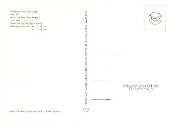 Meissen_Elbe_Sachsen Konditorei Café Zieger Meissner Fummel Spezialitaet Meissen_Elbe_Sachsen postalisch nicht gelaufen nach 1965 Erhaltung siehe scans [FriedD77] Frierer