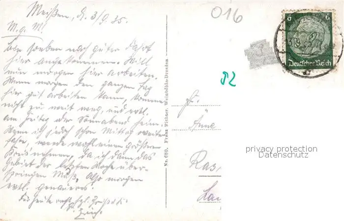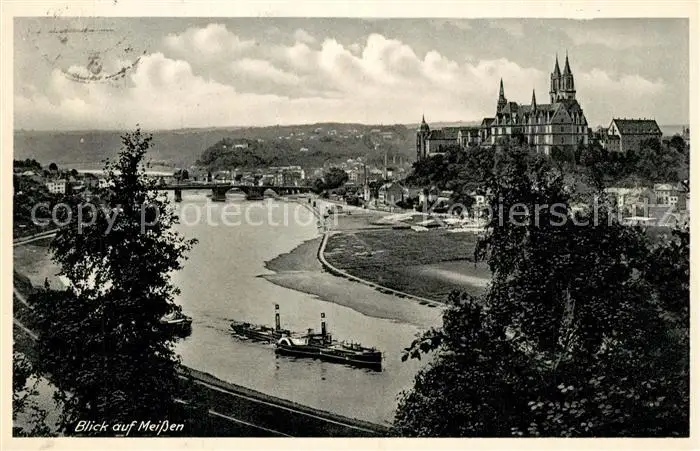 Meissen_Elbe_Sachsen Panorama Blick ueber die Elbe mit Albrechtsburg und Dom Meissen_Elbe_Sachsen postalisch gelaufen 1935 Erhaltung siehe scans [FriedD77] Frierer