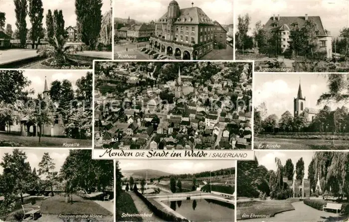 AK / Ansichtskarte Menden_Sauerland Bahnhof Rathaus Jugendherberge Kapelle Kirche Schwimmbad Ehrenmal Menden_Sauerland