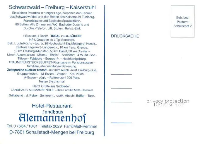Mengen_Schallstadt Hotel Restaurant Landhaus Alemannenhof Mengen_Schallstadt postalisch nicht gelaufen nach 1965 Erhaltung siehe scans [FriedD77] Frierer