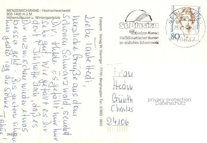 Menzenschwand Menzenschwand postalisch gelaufen 1996 Erhaltung siehe scans [LiesaD40] LiesID40
