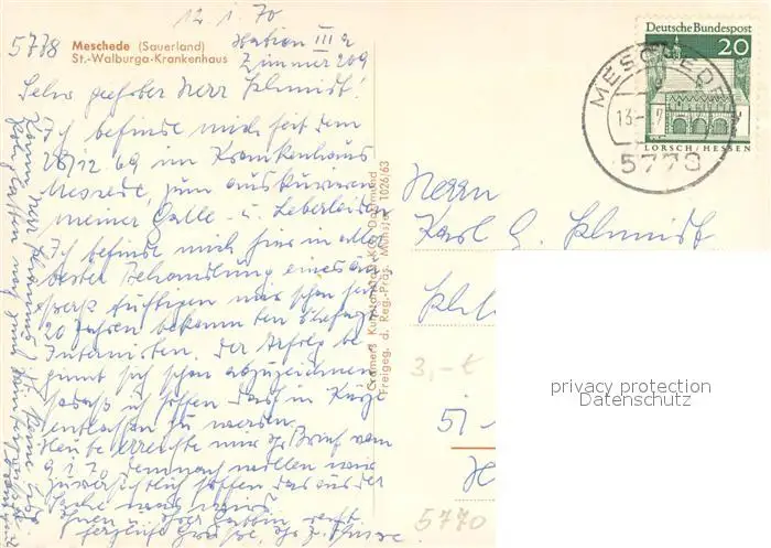Meschede St. Walburga Krankenhaus Fliegeraufnahme Meschede postalisch gelaufen 1970 Erhaltung siehe scans [FriedD77] Frierer