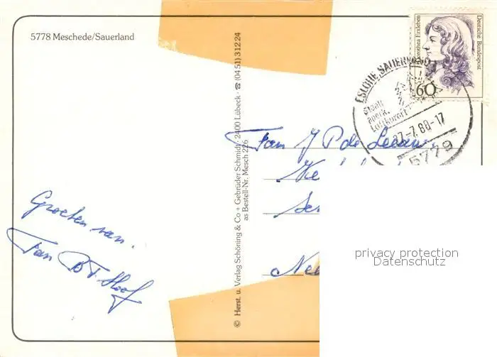 Meschede Stadtplatz Kirche Friedenskirche Winzinger Platz Schloss Laer Meschede postalisch gelaufen 1988 Erhaltung siehe scans [WerneD78] WernPID7
