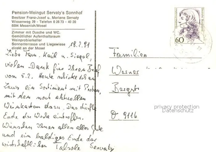Mesenich_Cochem Pension Weingut Sevaty's Sonnhof Landschaftspanorama Moseltal Weinberge Mesenich Cochem postalisch gelaufen 1991 Erhaltung siehe scans [FriedD77] Frierer