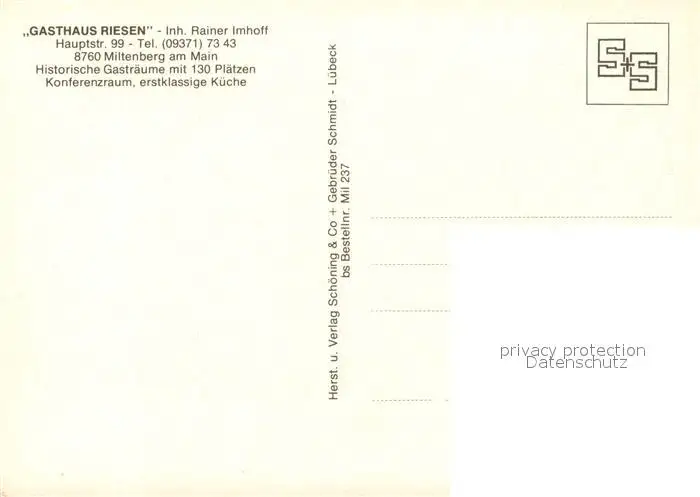 Miltenberg_Main Gasthaus Riesen Gaststube Miltenberg Main postalisch nicht gelaufen nach 1965 Erhaltung siehe scans [WerneD78] WernPID7