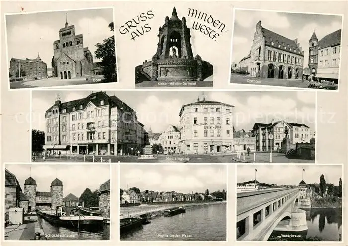 AK / Ansichtskarte Minden_Westfalen Dom Kaiser Wilhelm Denkmal Rathaus Stadteingang Schachtschleuse Weserpartie Weserkreuz Minden_Westfalen
