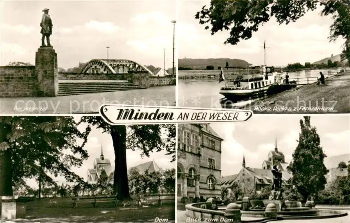 AK / Ansichtskarte Minden_Westfalen Partie am Wesertor Denkmal Statue Fahrgastschiff Dom Brunnen Minden_Westfalen