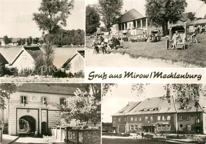AK / Ansichtskarte Mirow Badestrand Mirower See Mecklenburgische Seenplatte Torhaus Bahnhof Mirow
